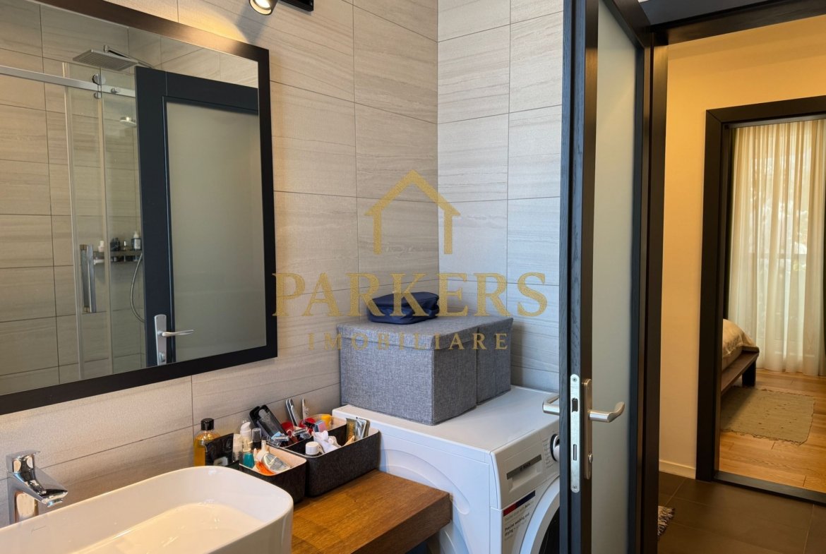 Baie modernă: Finisaje premium în tonuri naturale, cu dotări sanitare de ultimă generație.