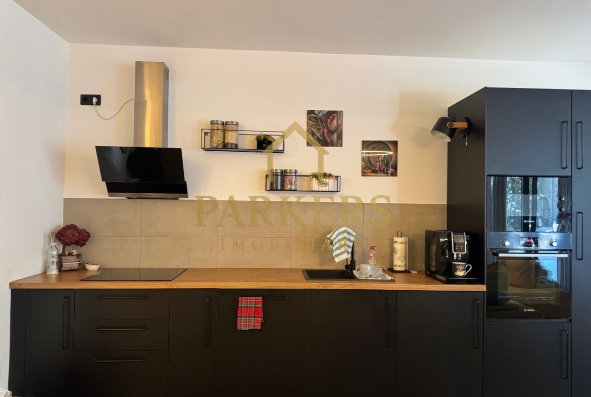 Bucătărie complet echipată: Electrocasnice încorporate gama Bosch, mobilier negru mat și blat cu textură de lemn.