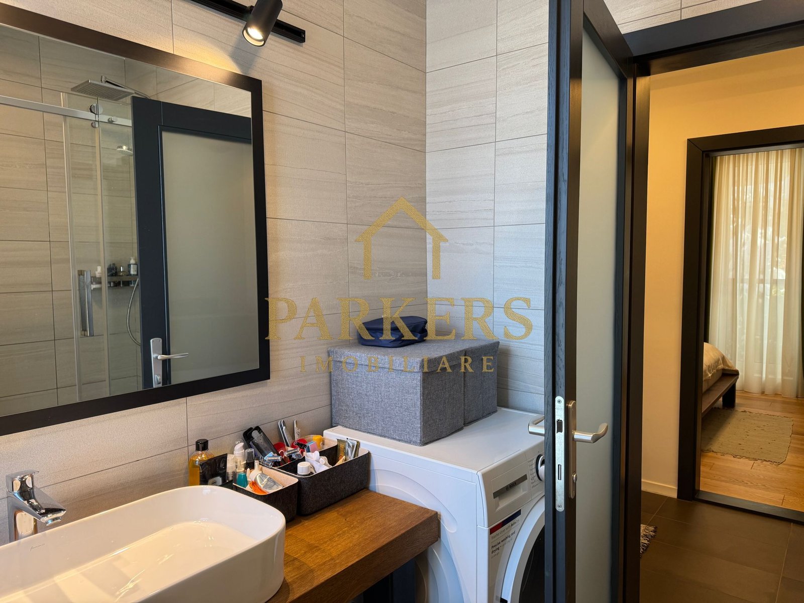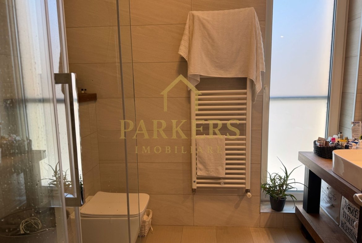 ​Baie modernă: Finisaje premium în tonuri naturale, cu dotări sanitare de ultimă generație.