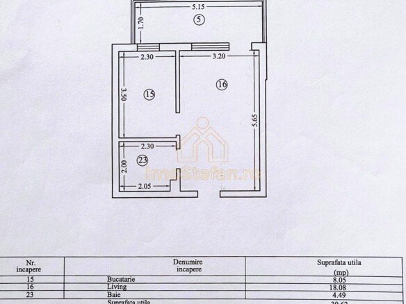 Bucătărie (Camera 15): Separată, cu o suprafață de 8.05 mp, oferind suficient loc pentru gătit și un mic dining.
