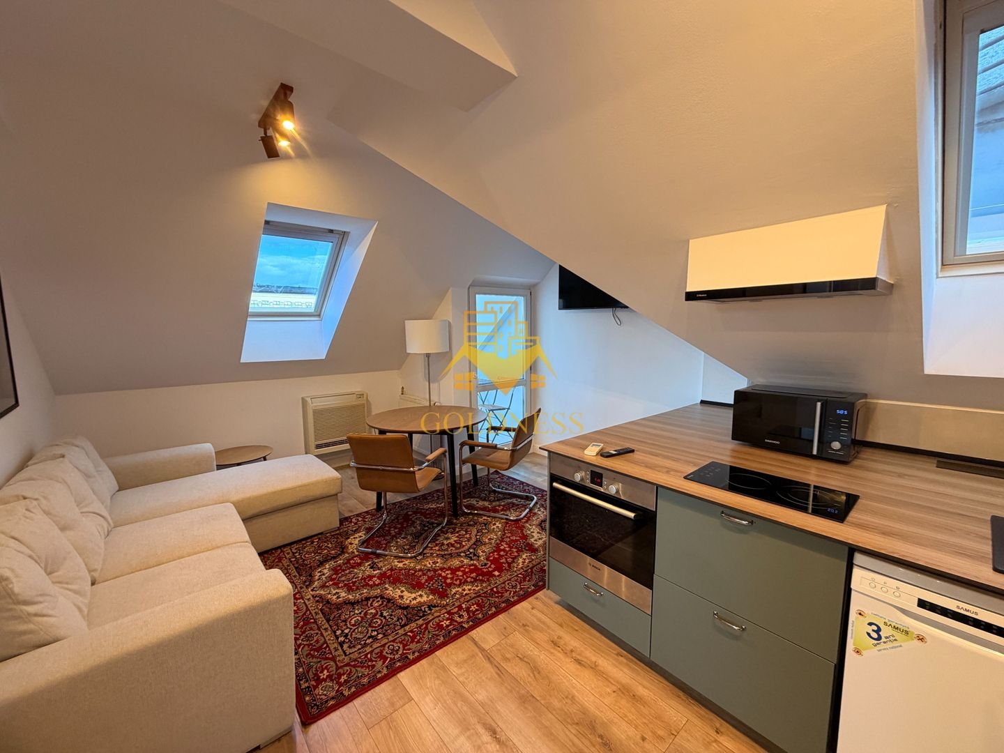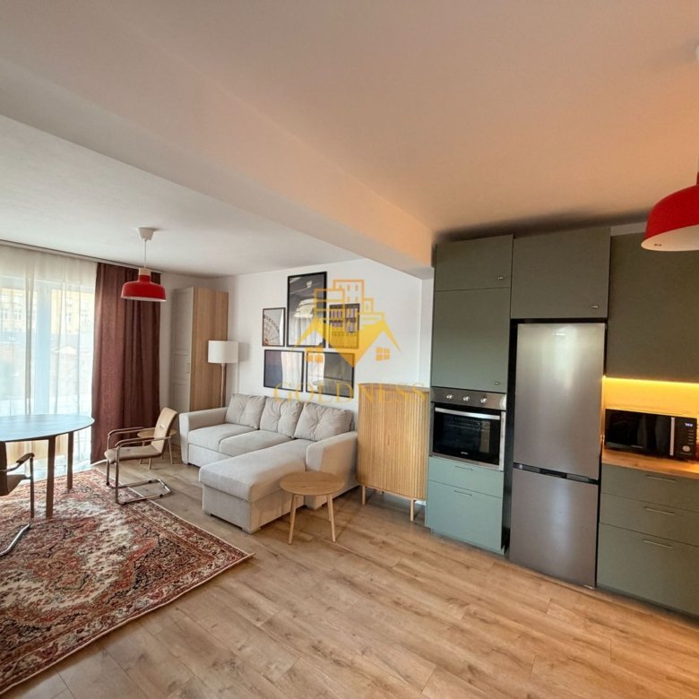 – living cu bucatarie open space complet utilată și mobilată, canapea extensibilă, loc de servit masa