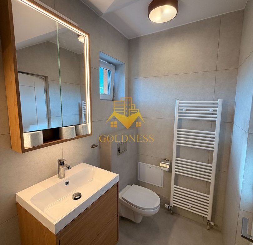 – baie cu cabina de dus, calorifer port prosop și dulap pentru depozitare.