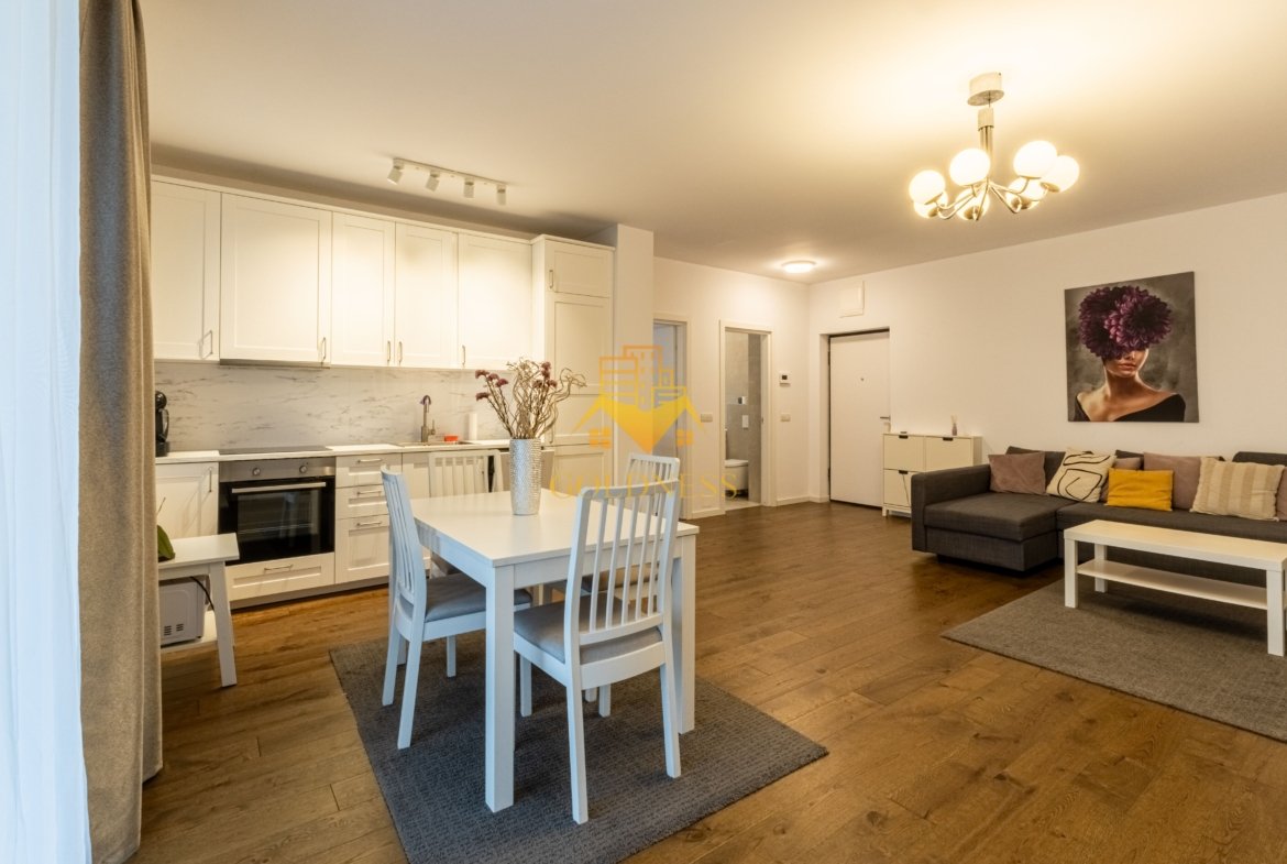 – living cu bucatarie open space complet utilată, canapea extensibilă, loc de servit masa