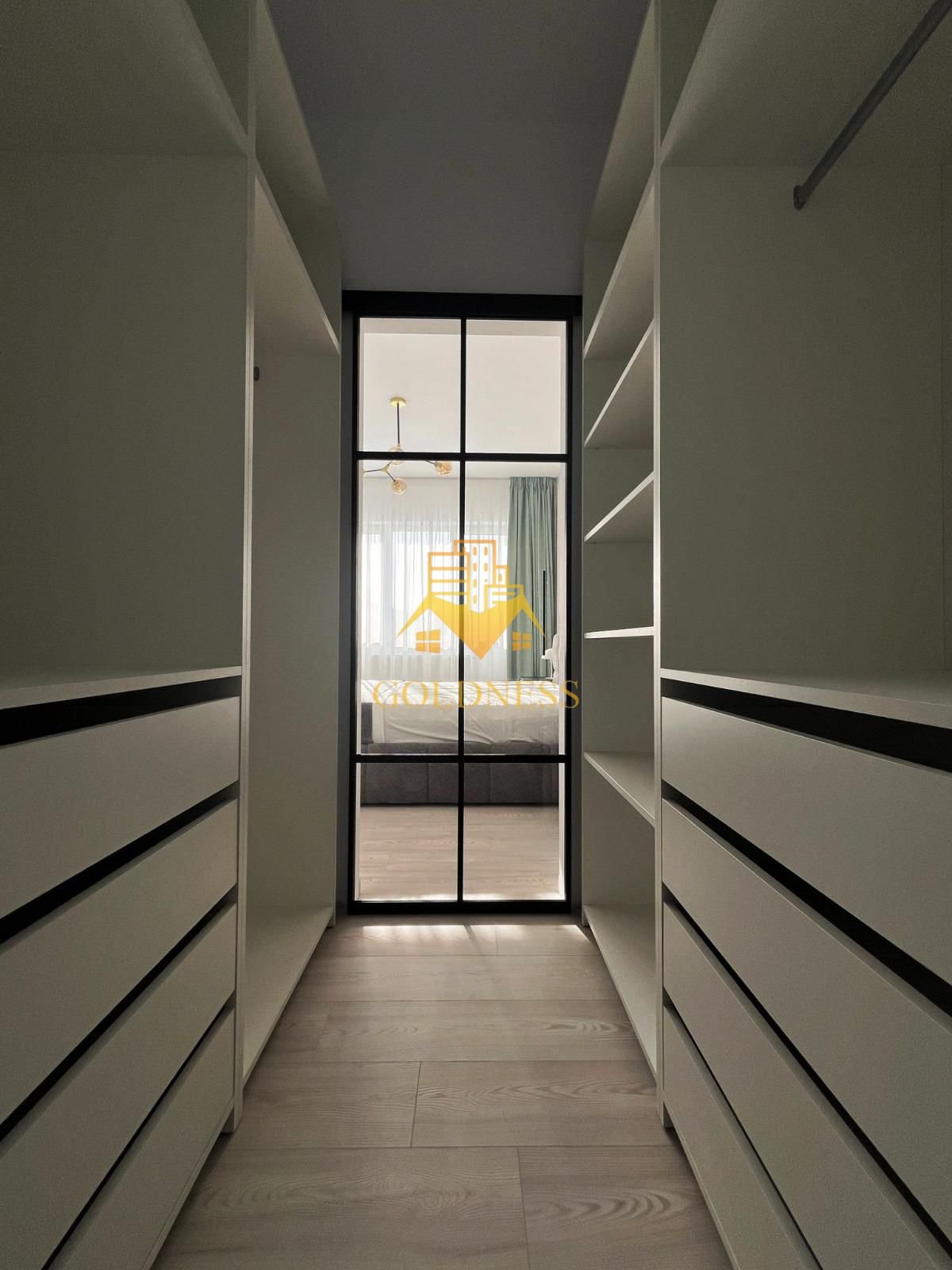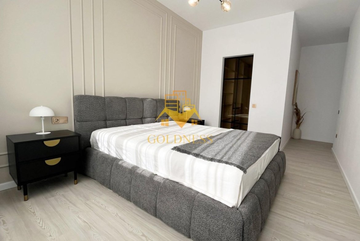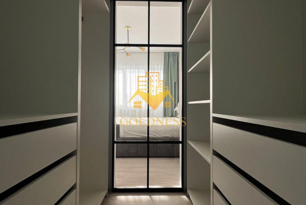 – dormitor cu pat matrimonial, noptiere, dressing generos
