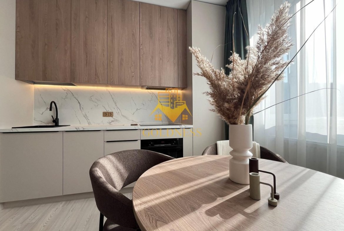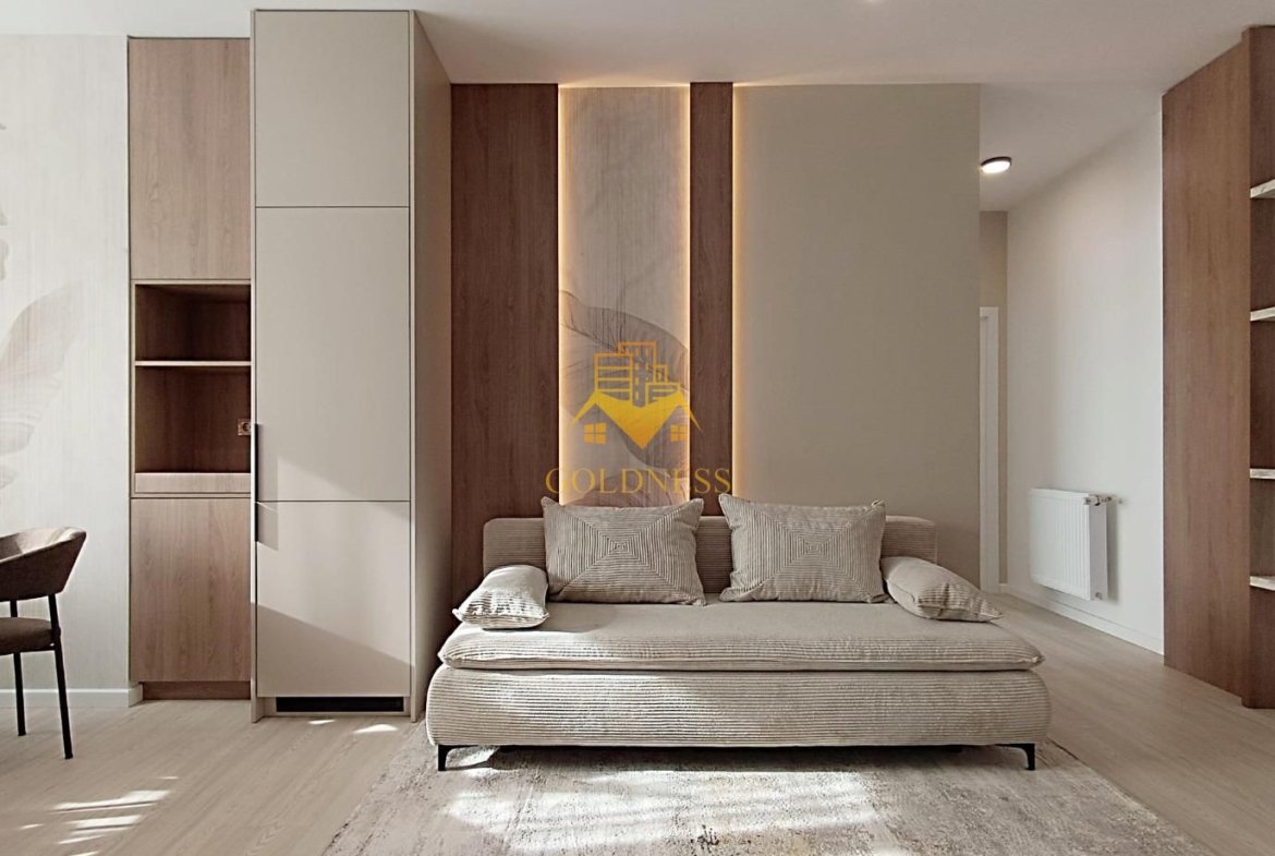 – living cu bucatarie open space complet utilată și mobilată, canapea extensibilă, loc de servit masa