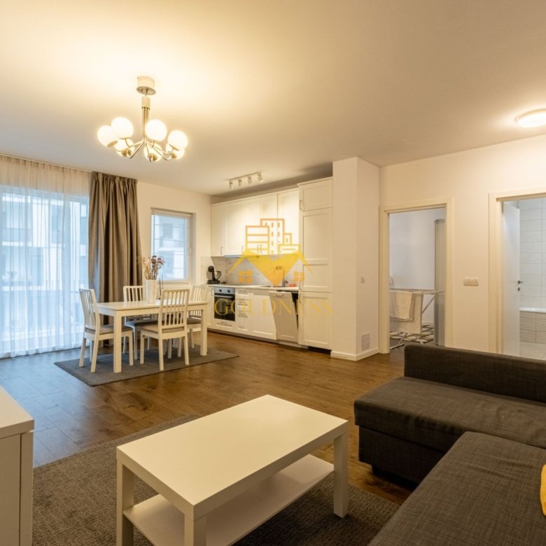 – living cu bucatarie open space complet utilată, canapea extensibilă, loc de servit masa