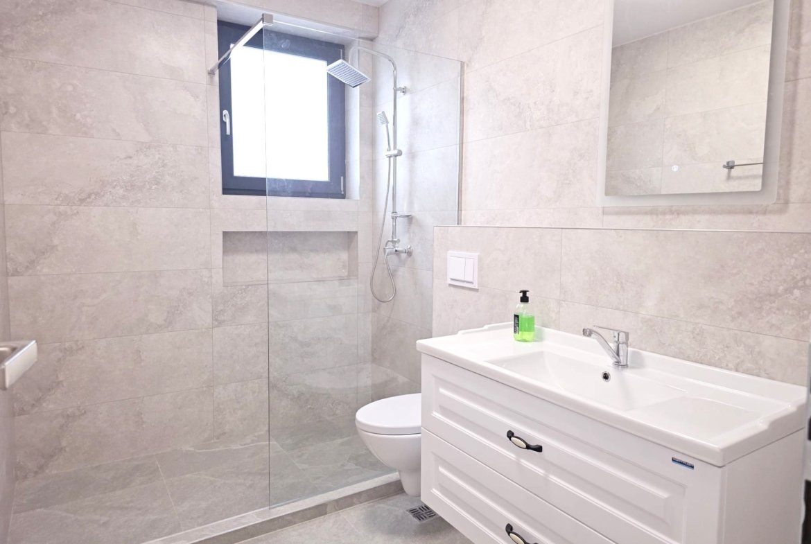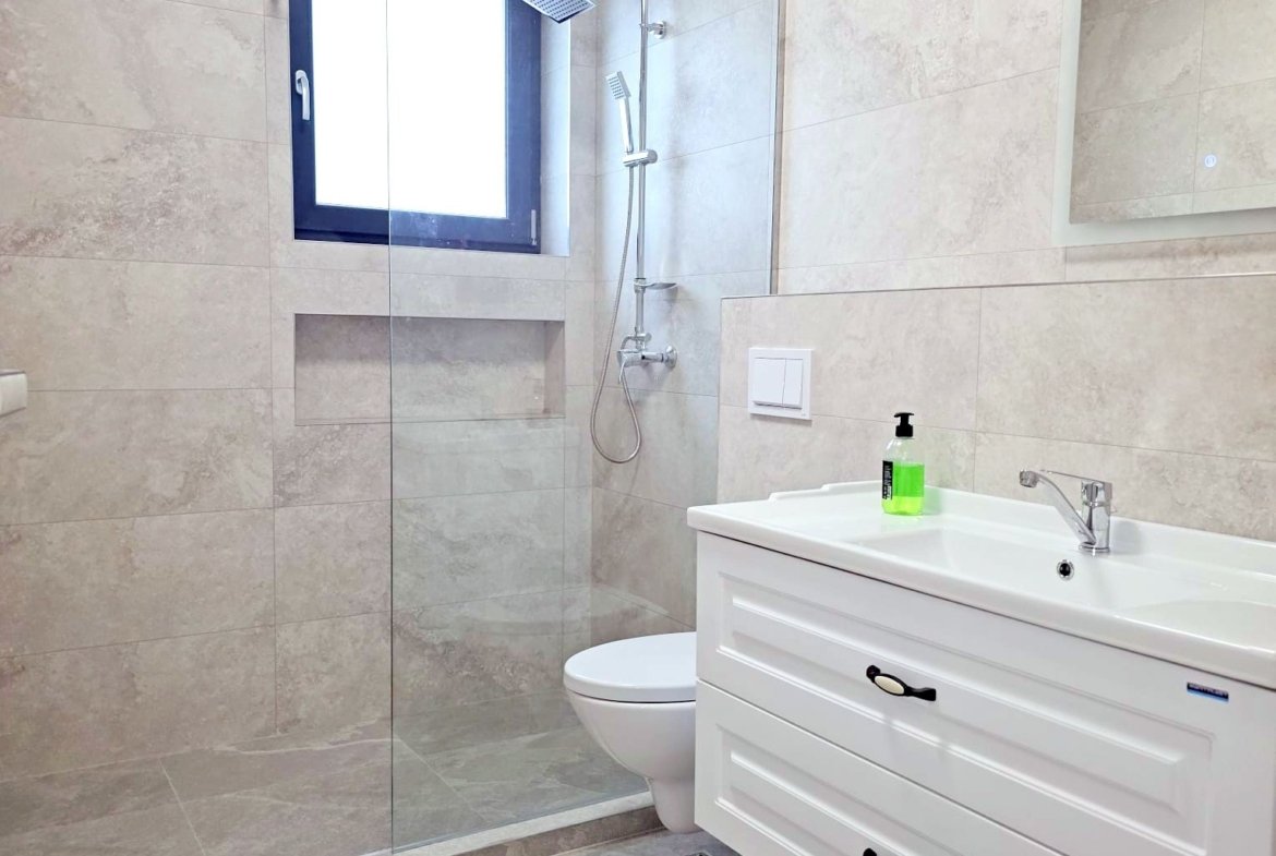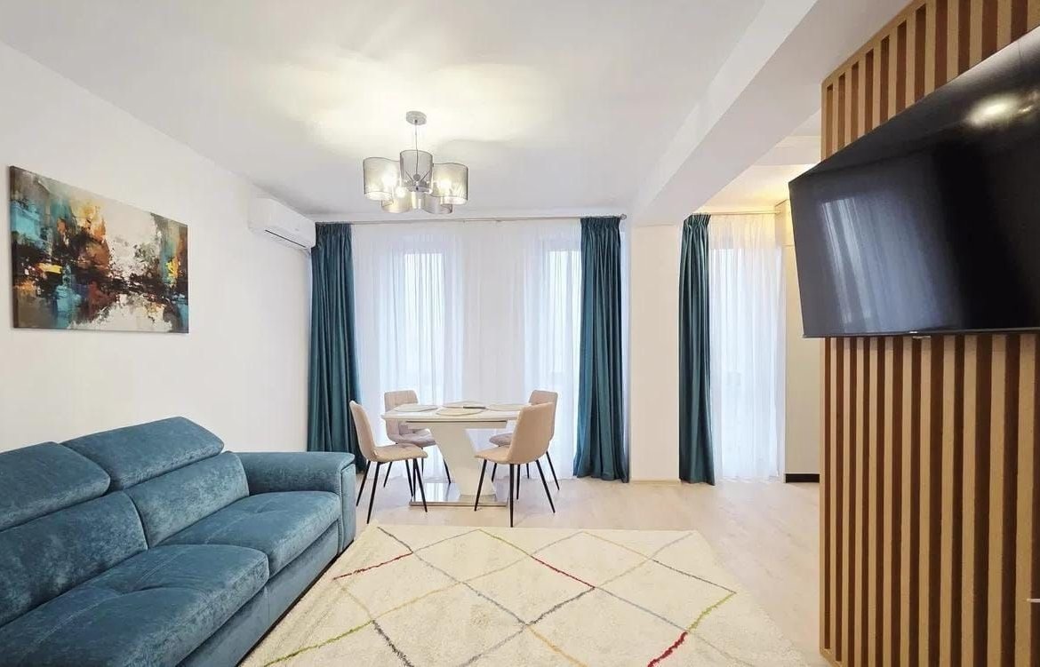 Locuinta este finisata complet si se afla la prima inchiriere, totul fiind nou – de la finisaje pana la mobilier si electrocasnice.