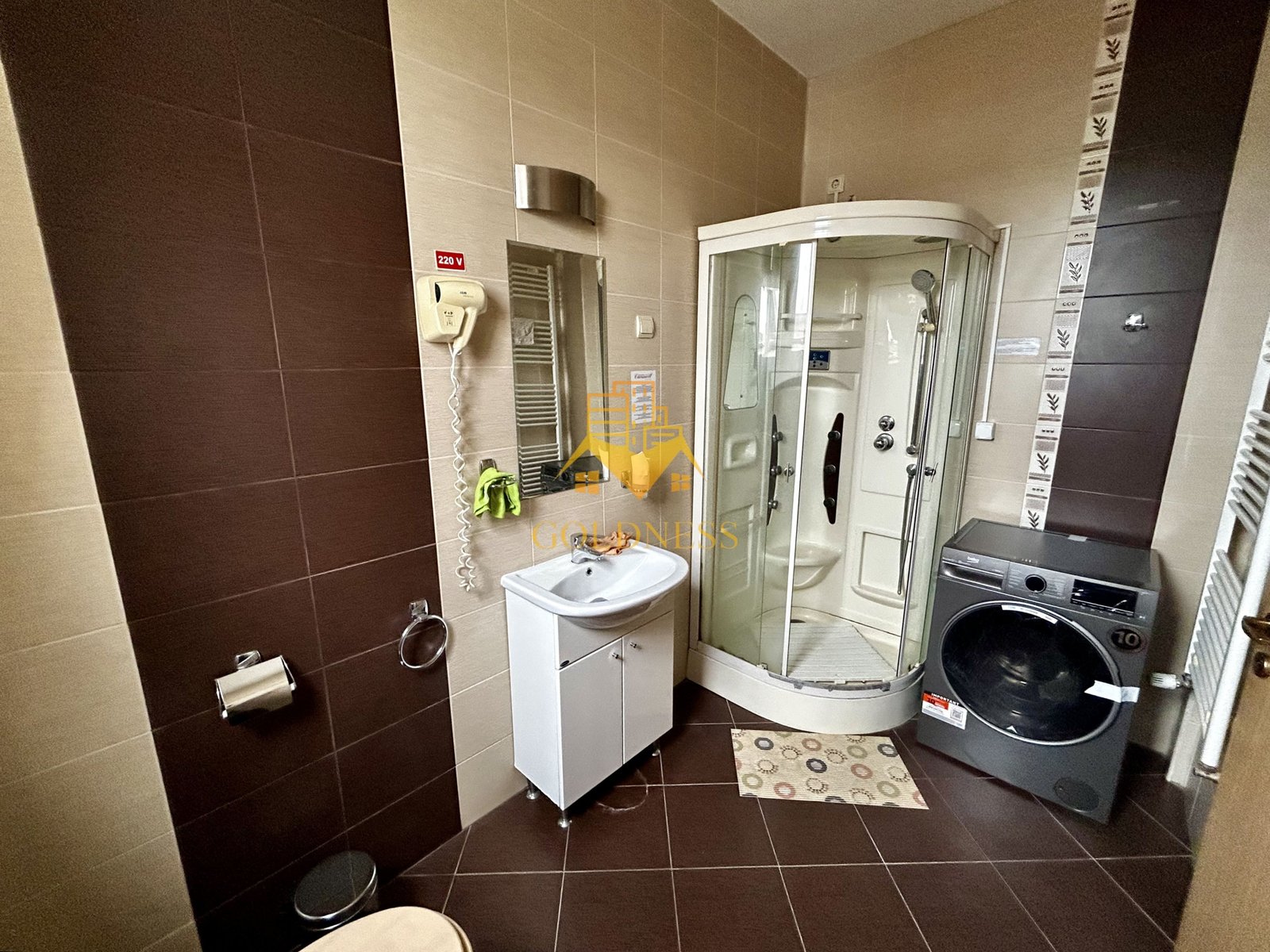 – baie cu dus, calorifer port prosop și dulap pentru depozitare.