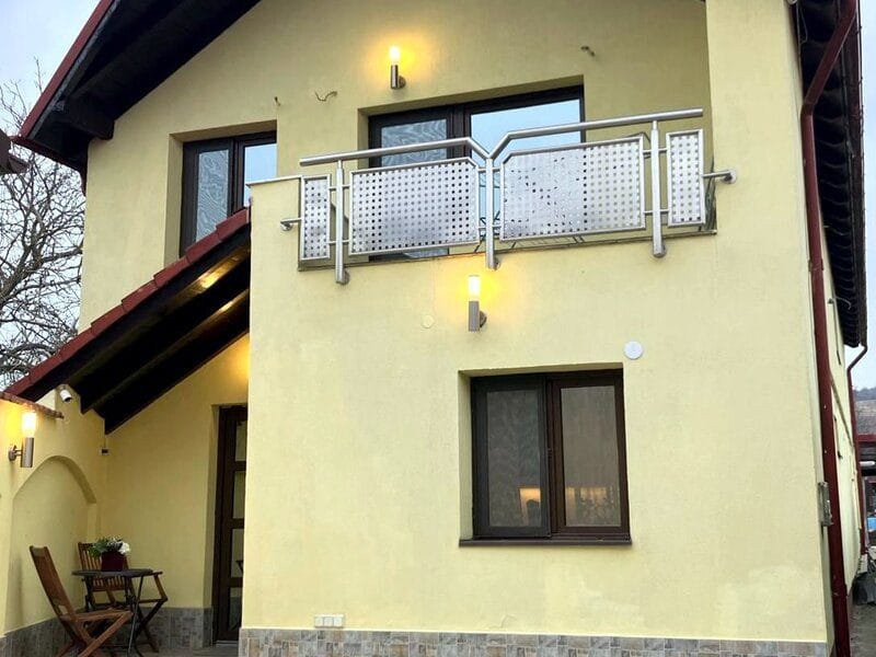 Parcare acoperita: 4 locuri. Terasa ~15mp in partea din fata + in partea din spate o terasa de ~50mp, cu constructie din lemn masiv cu gratar zidit.